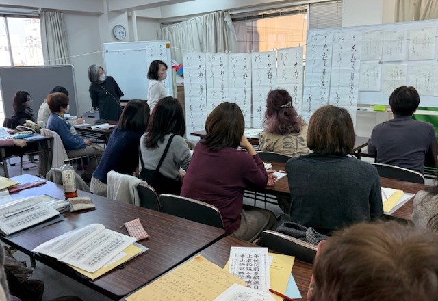 4月に実施される師範・昇段昇級試験に向けての勉強会が神田の平澤ビルの事務所で開催されました。漢字、かなの師範・昇段・昇級試験の課題ごとに支部長先生方が書かれた作品がぎっしり貼られました。漢字作品については大塚桐霞会長、吉田銘霞副会長が解説を担当され、貼られた作品を一枚ずつ丁寧にチェックしてくださいました。かな部では専務理事の白鳥楓琫先生と常務理事の足立金啓先生が解説を担当され、誤字に見られやすい字などご指導くださいました。また、会場にいらした先生方からも活発にご指摘や質問もありました。今年から、名列速報のお知らせに参考手本を掲載せず、作品を書いて勉強会に参加された先生方に書いて来た書体のみ参考手本を配布するという方法に変更されました。その結果、各先生が必死に各書体を揮毫して持参し、熱心さがより増したように思います。試験課題の手本は受験する生徒が書いたときに誤字にならない様にわかりやすく書くことが重要です。2月、3月の研究会は「試験課題の添削会」です。是非、積極的にご参加ください。