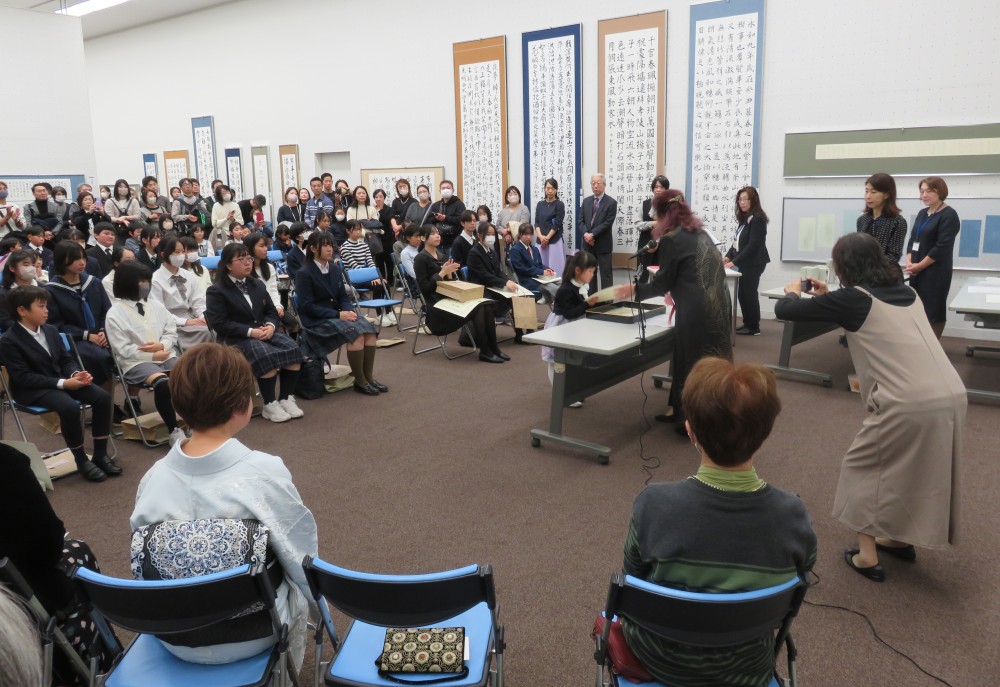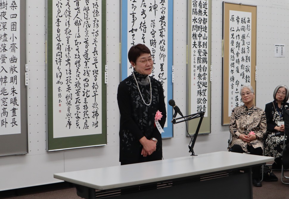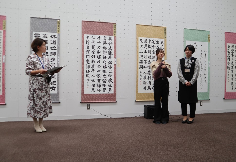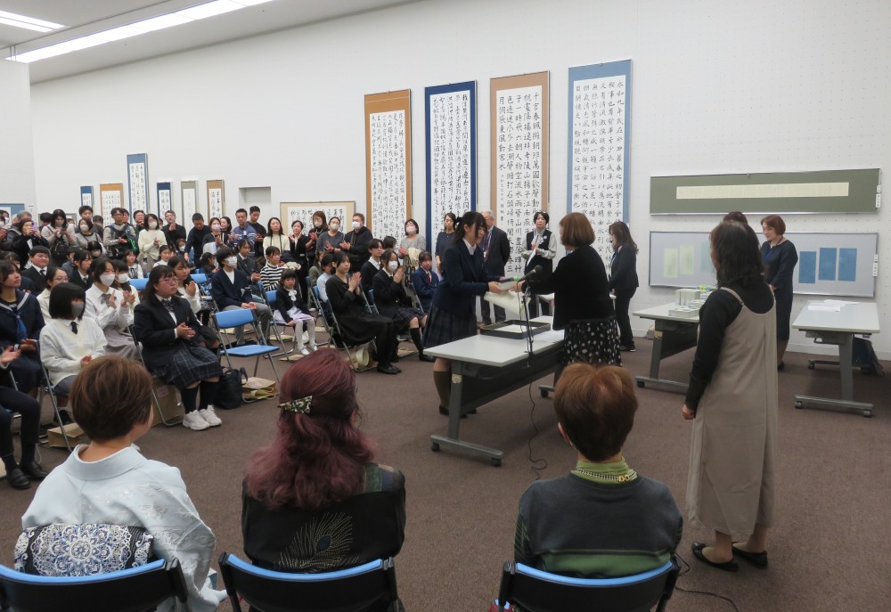 授賞式が12月7日(日)、美術館会場にて行われました。会場で授賞式を行うのは本年が初めてでしたが、作品に囲まれての授賞式もまた明るい雰囲気で良かったです。始めに澤田紫鈴専務理事より詳しい審査報告がありました。大塚桐霞会長は人間国宝の刀匠、河内(かわち)國平(くにひら)さんのお話をされました。「人間国宝となり、84歳になった今でも、自分が打った刀でこれが最高と思ったことは一度もないそうです。鎌倉時代の刀工政宗の作った名刀が目標で、それを見て感じ取り、技術だけではなくそこに込められた気迫を感じ取って自分に落とし込んでいる。これは書道においても同じことではないでしょうか。」とても心に響くお話でした。榎本宏霞名誉顧問からは「皆さんの作品を拝見して、努力は裏切らないと感じました。展覧会は毎月の競書でどれだけ臨書を積み重ねたかということが試される場です。その鍛錬が作品の創作をする際に表れており、将来が楽しみで幸せな気持ちになりました。」とご祝辞をいただきました。