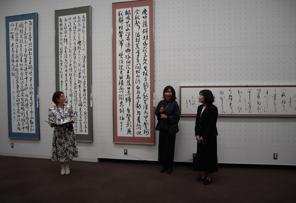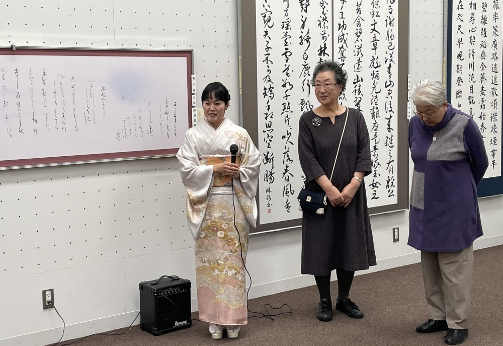 「一般部」で東京都知事賞を受賞した宮本雅葉さんは、霞葉支部の蓑霞葉先生を交えてお話されました。作品は元好問の「山居雑詩」六首のうちの四首、80文字です。仕事が忙しく書を書くのは早朝や深夜が多いとのこと、そして締め切り間際には書きすぎて膝が内出血してしまったという驚きのエピソードもありました。「バタバタと過ごしている中で、書道をしている時間は集中できます。集中とリラックスが同時に訪れる不思議な時間です。」とお話されました。蓑先生は「宮本さんとは楽しい趣味の話もしますが、一度スイッチが入ると2時間くらい黙々と書いていて集中力がすごいので、教室の学生さんにも良い影響を与えてくださっています。」とお稽古場での様子もお話くださいました。