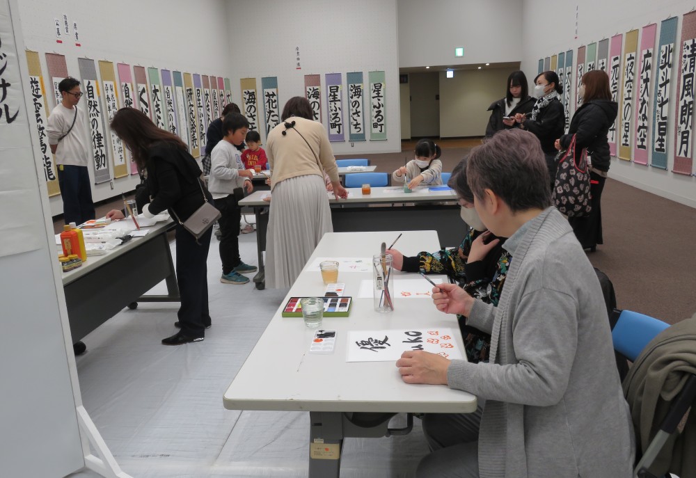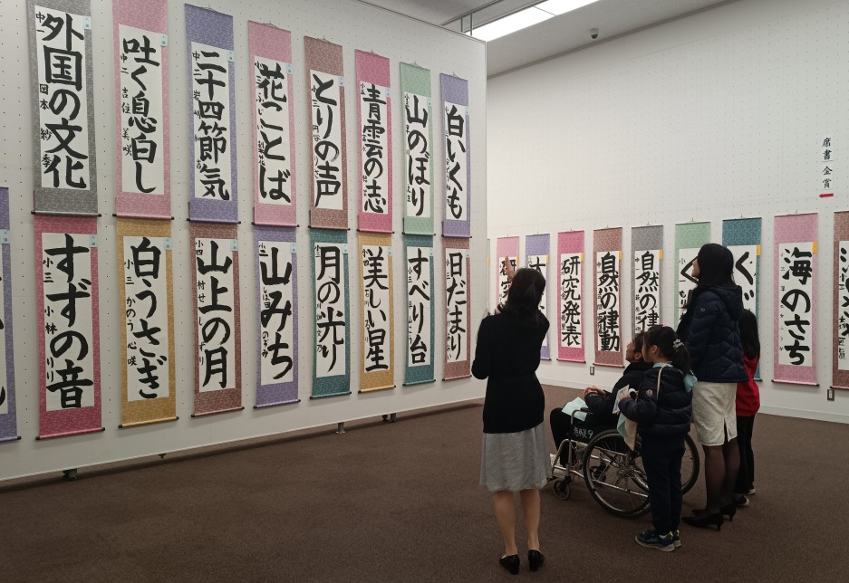 好天に恵まれた12月4日(火)から11日(月)まで、東京・上野公園内にある「東京都美術館」で「第59回書心学生展」が開催されました。今年の7月には「席書大会」が開催されました。公募の部225作品、席書の部75作品、合わせて300作品が会場の壁面いっぱいに展示されました。会場に一歩足を踏み入れると、子ども達の力強く伸びやかな作品に圧倒されました。小さい方の微笑ましい作品もありました。日比谷で開催したイベントも好評だったため、12月6日(土)ワークショップ「オリジナルクリアファイルをつくろう!」を今年も会場で開催しました。参加した子ども達は思い思いの文字や絵をクリアファイルに書き、家族連れで楽しんでいました。12月7日(日)午前中から美術館展示会場にて授賞式が行われました。はじめに澤田紫鈴専務理事から審査報告がありました。大塚桐霞会長は「皆さんの作品を拝見すると、心を込めて一画一画書いたことがひしひしと伝わってきます。書道は字を上手に書くことだけのお勉強ではありません。集中し心を込めて書き、表現すること、これは大切な人間の成長につながります。」と話されました。嶋田蕙窗名誉会長は今回受賞できたことの「四つのおかげ」についてお話されました。「一つ目は暑い中頑張って書いた自分のおかげ、二つ目は丁寧に指導してくださった先生のおかげ、三つめはそれを支えてくださった家族のおかげ、四つ目は一緒にお稽古しているお友達のおかげです。お友達がいたから頑張れたということに感謝しましょう。」とご祝辞を頂戴しました。賞状賞品授与では皆緊張していましたが、閉式後には緊張もほぐれ、学生展の受賞作品の前に移動し、ご指導の先生と揃って満面の笑みで記念撮影に臨みました。会期を通して「花の字をみつけよう!」というイベントを行いました。このイベントは審査員の先生の作品から「花」の字を探すイベントです。家族で楽しんでいただき、学生の作品だけでなく大人の作品を見る良いきっかけになっています。子ども達が長く書を続けて、いずれは書心展に出品する時が来ることを願います。